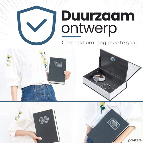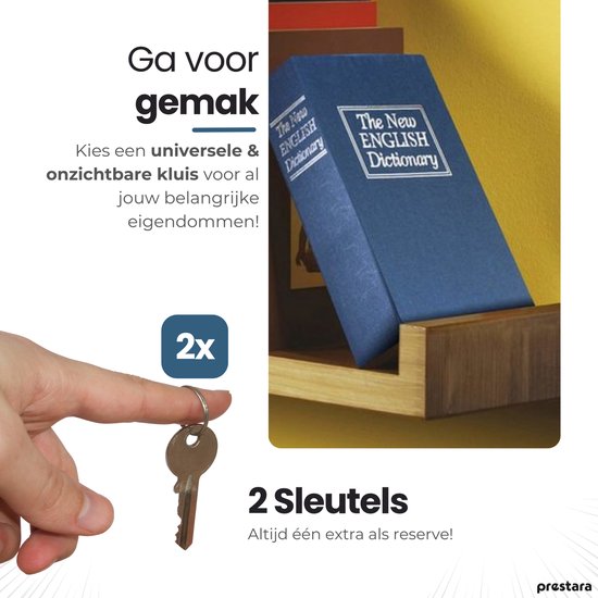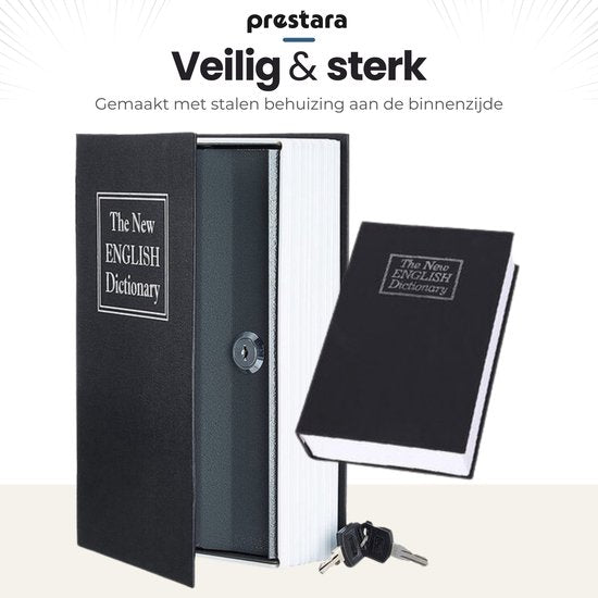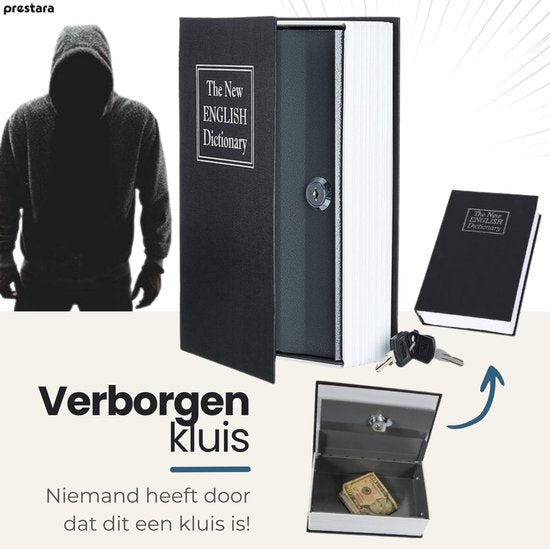 De Prestara boekkluis is het ideale kluisje om je waardevolle spullen zoals paspoorten, sieraden en horloges veilig te bewaren. Deze verborgen kluis lijkt precies op een woordenboek, waardoor hij perfect onopvallend in je boekenkast past. Het realistische design maakt dit boek kluis niet alleen praktisch, maar ook discreet. Ideaal voor thuis, op kantoor of zelfs onderweg. Met deze boekkluis blijven jouw kostbaarheden goed beschermd tegen diefstal.